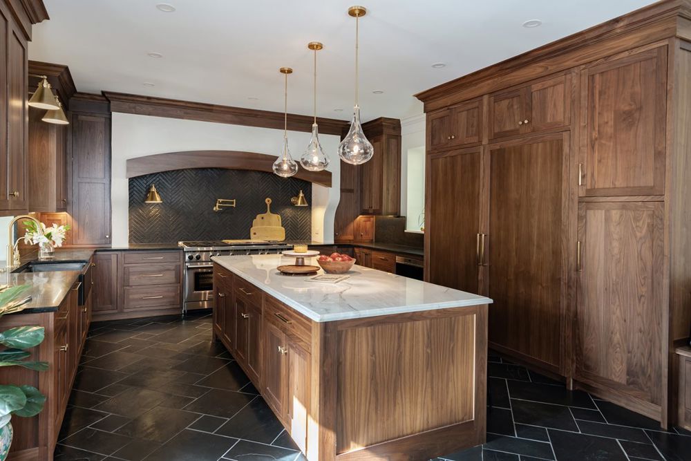 This 1929 English Manor home was originally designed for live-in staff and a commercial-grade kitchen. Dated finishes and closed-off spaces warranted a spatial overhaul in both function and appearance. A new kitchen, wet bar, and mudroom, paired with wide arched openings, were finished with rich materials. Walnut and brass accents, black Versailles pattern slate floors, and nature-inspired murals provide continuity and a connection to the outdoors. A gorgeous transformation and delighted clients were the end result.