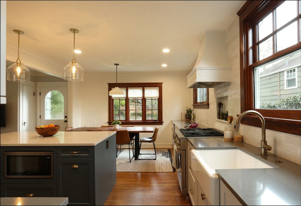 The owners of this 1930 Storybook Cottage had grown tired of their cramped kitchen. Storage was hard to come by while the awkward layout and lack of landing space would leave any chef uninspired. ReCraft went to work, opening the walls between the kitchen, dining, and living room to achieve an expansive, functional layout. An elegant quartz island defines the kitchen with seating tucked under a stunning waterfall. Great care was taken retaining historic details, matching the original windows and new oak flooring seamlessly lacing into the original flooring. Layered lighting and traditional details stylize the kitchen at every turn.