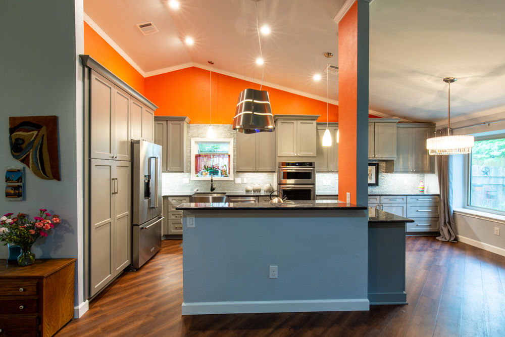 This 1657-square-foot home's former kitchen was claustrophobic, had limited counterspace and storage. This client dreamed of updating her dark 1980s kitchen and wanted some pizazz. Removing a half wall that divided the livingroom and kitchen, and transforming the narrow split-level area into a flat 42-inch wide workspace opened the space. New shaker cabinetry with an eight-foot tall built-in pantry, pull out shelves, a 10-foot sideboard, and island with drawers and doors on all three sides gives this homeowner plenty of storage and a mixer lift. The orange accent color, stainless steel appliances and an Italian rangehood all command attention.