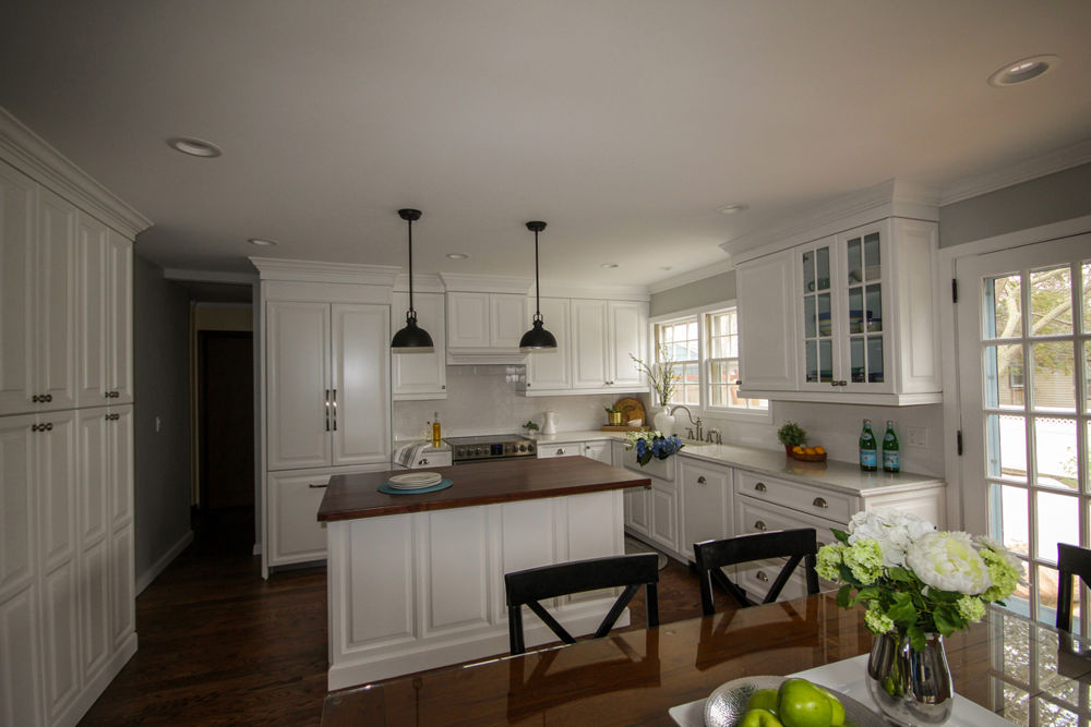 The homeowners knew what they wanted their new kitchen to look like. They desired integrated appliances with panels and the sink had to stay in its existing location to maintain the integrity of the original windows and the exterior's original cedar siding. The new classic farmhouse kitchen has an open concept, achieved by removing walls from the dining room and kitchen to accomodate their family life. Features include custom white cabinetry with integrated panels to hide appliances, brushed nickel cup pulls, white subway tile in a herringbone pattern, a butcher block topped island and black pendant lighting.