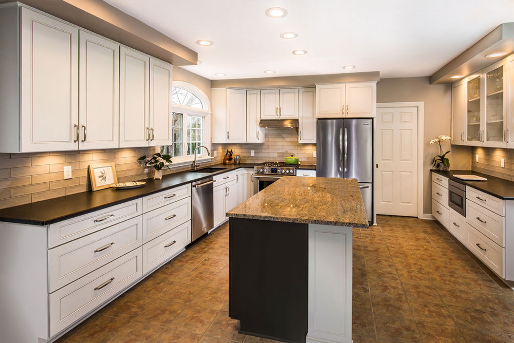 The homeowners were tired of dealing with serious flaws in their kitchen, due to poor design in the original build. Additionally, the kitchen's outdated appearance and low-quality materials were not aligned with the home's value. The homeowners wanted the project to be low-impact to their household, with a modest budget. Cabinet refacing solved the quality and appearance issues while preserving the budget and keeping disruption to a minimum. Finishes include refaced white perimeter cabinets with leather-finished granite countertops, silver gloss subway tile, and a contrasting island in a forest black finish. Stainless steel appliances and LED under cabinet lighting help finish the space.