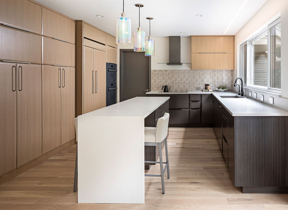 This clients' kitchen was uninspiring and dated. They desired a peaceful space with a fresh, modern style and more natural light. Adding a more cohesive and custom cabinet layout was key to overhauling storage in the kitchen, while enlarging the windows added light and enhanced backyard views. Warm toned cabinetry helps avoid the clinical look of many modern kitchens, while dichroic glass pendants above the island and a mirrored backsplash tile provides texture and personality. The kitchen is now refined and modern, with subtle textural interest.