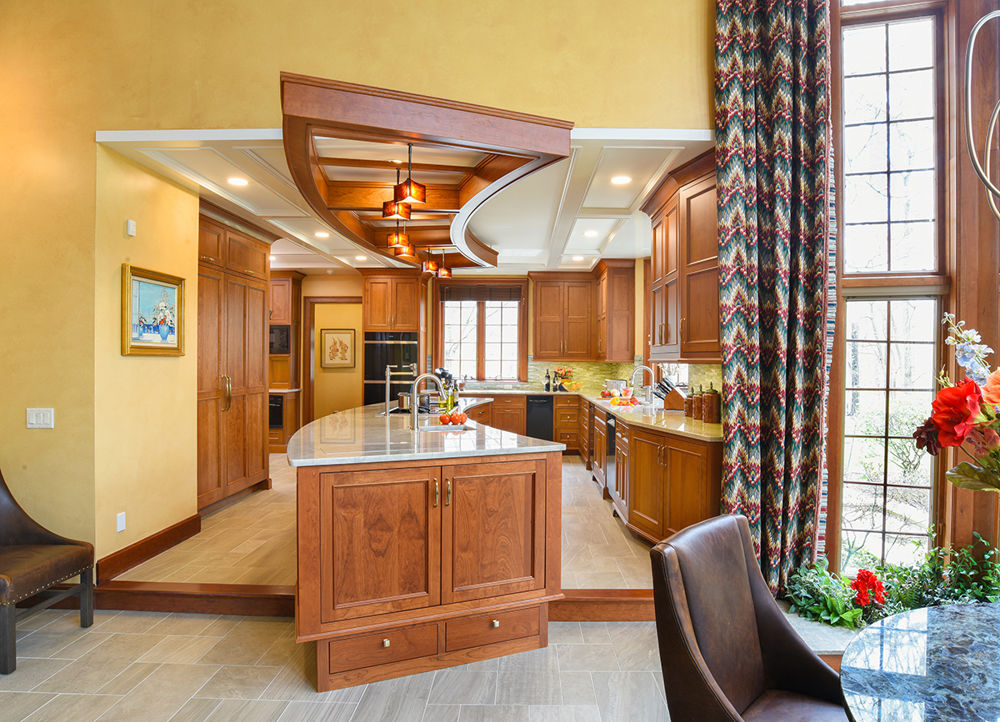 This kitchen's unique design was achieved using varying shapes and sizes as well as rare and exquisite materials. The clients desired a modern culinary kitchen with a curving island that connected to their dining area. Challenges included integrating a curved island into an area where the doors and windows could not be moved because of the limestone on the exterior. Removing an existing peninsula and replacing it with a racetrack circulation pattern allowed for the new 16-foot island. Other design features include a second coffer system with custom light fixture mounts shaped like the island. The result is a space that brings the clients joy every time they use it.