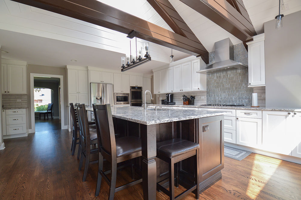 The primary goal of this residential kitchen remodel was to improve the kitchen's overall aesthetic and function to meet the clients' current and future needs. The clients desired more countertop space and cabinet storage. Additionally, they wanted their kitchen design to reflect on the rest of their earthy, modish home. Relocating the doorway, redesigning the layout, removing a post from the island and adding more cabinetry accomplished these goals. To help lighten the space, a dynamic color pallet that features white cabinetry, a silver haze tile backsplash and quartz countertop was used to complement and seamlessly pull together the existing exposed brick and exposed beams.