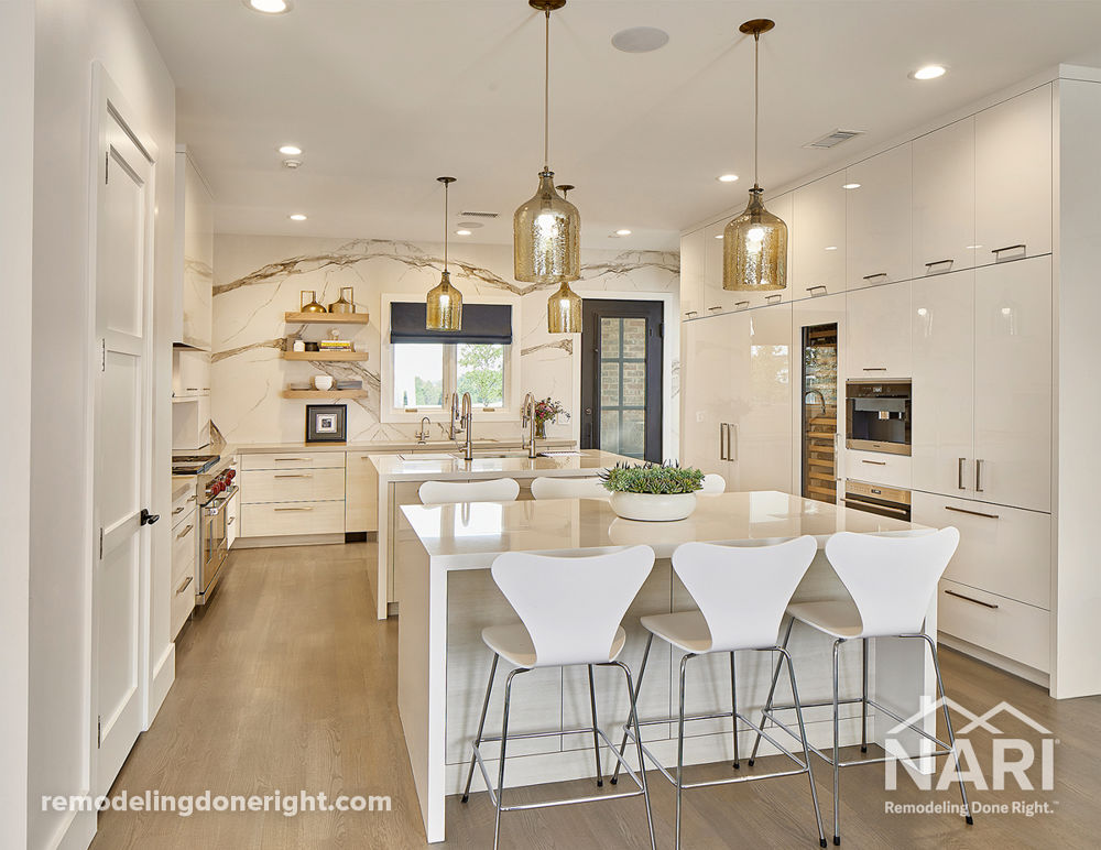 Originally built in 2000, this kitchen was tired and unoriginal and included glossy black countertops, white cabinetry and tiled flooring. The new owners had a flair for the spectacular and desired a new kitchen suitable for entertaining, often 75 to 100 guests. They wanted the quality and durable factory finished cabinets, the best appliances they could afford, blended into a unique design. An eat-in island was also a must. Throughout the process, they discovered exactly how big their dreams really were! The new space features glossy white flat front cabinetry, Sub-Zero/Wolf appliances, quartz and Ceasarstone countertops, bookmatched, white porcelain slab walls with veining, and two islands.