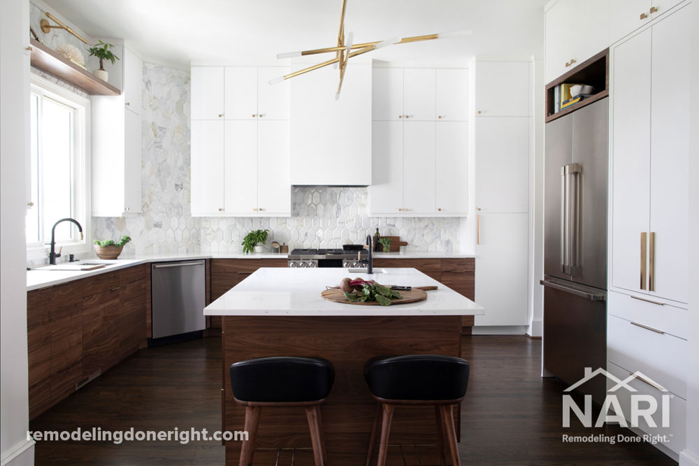 A stylish couple owned a stylish home with the least stylish kitchen ever. Builder grade basic white cabinets with antiquated countertops and an overly tight layout needed to go and an odd room shape had to be addressed. The design maintained the existing footprint but an open, functional and airy space was created. A large island with fantastic storage and adequate seating anchors the room, while beautiful beveled hexagon tile from countertop to ceiling adds texture and detail without overwhelming the space. The light palette is balanced with rich walnut base cabinets, glowing gold hardware and black plumbing fixtures.