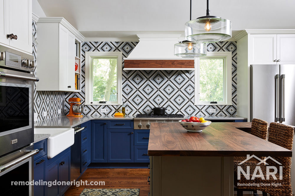 The cramped, isolated kitchen in this 1980s era home did not fit the clients' lifestyle nor take advantage of the beautiful views of the nearby pond and woods. They longed for a functional yet fabulous space to support collaborative cooking and family gatherings. A micro-addition facilitated a new layout that both opened to and enlivened their existing living and dining spaces. A bold tri-color palette along with pro-level appliances and impeccable finish detailing gives them everything they desired and more. They are so grateful for the meticulous craftsmanship and are thrilled with the final result.