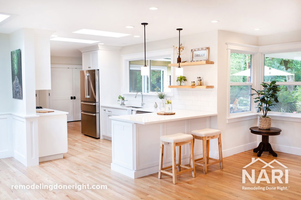 The clients desired a more functional, open and elegant kitchen. To transform the cramped and dark space, the overall kitchen layout and design was changed without compromising storage. The new open floor plan increases site lines from the kitchen into the rest of the home. Finishes include custom Shaker style cabinetry in white, quartz countertypes, all new stainless steel appliances, white subway tile, and brushed nickel bar pulls and knobs. Skylights over the sink were added to provide natural light, while under-cabinet and can lighting added abundant illumination in this charming new kitchen.