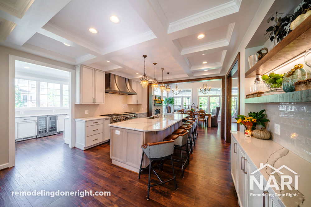 The clients wanted to improve their kitchen layout and function, brighten up the space and update cabinets and finishes. Repurposing the existing nook into a convenient Butler's Pantry/Scullery where chef prep functions could be easily accessible but not as visible, updating the kitchen with new cabinets, appliances, flooring, walls, finishes and fixtures, and re-working the ceiling aesthetic helped achieve this. Improving circulation throughout enhanced the visual connection within the workspace. The kitchen's timeless design includes Cambria quartz countertops, a high gloss artisan ceramic subway tile backsplash, a stained wood island, and crisp white cabinets.