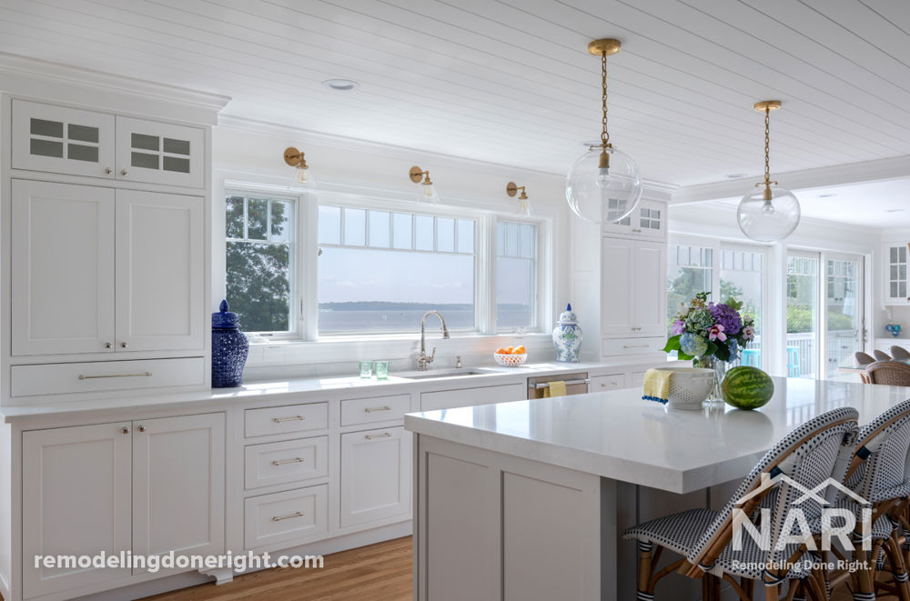 This beautiful coastal home features a newly designed spacious kitchen with ample space for cooking and entertaining. The original cramped and outdated kitchen with dark cabinetry was modernized into a spacious kitchen with a functional island, bright white cabinetry, gorgeous white tile behind the cook top and new hardwood floors. The space features a bar area for entertaining guests and updated appliances as well. The open floor plan combines the newly renovated kitchen and dining area with the living area while capturing the views of the Atlantic Ocean, creating an inviting space for both intimate family meals and dinner parties with guests.