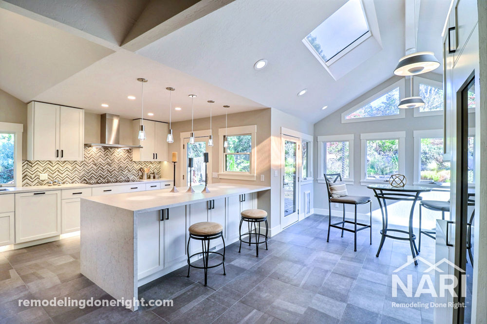 When the clients entered the old kitchen of their traditional California ranch-style home, the garish oak wood and bold wall colors transported them back to the late 1970s. The clients wanted to elevate the style of their space with contemporary cabinets and an innovative open-concept design. The new, spacious chef-style kitchen doubles as a dazzling entertainment area and includes a transitional design with more storage and natural light, accent lighting throughout, and small pops of color in the herringbone backsplash. This transformative remodel brought this outdated ranch and its owner gleaming into the 21st century.