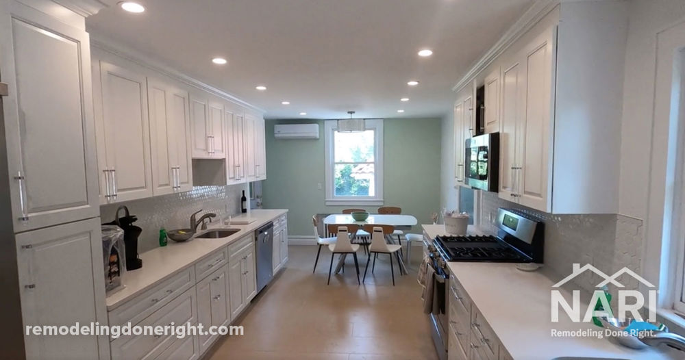 The homeowner purchased this five bedroom, four-and-a-half bathroom house in 1980, which was built in 1913, and used it as a rental for 40 years. Its enormous kitchen was left exactly like it was in the listing in 1980. The clients requested a Kosher kitchen with storage to handle two full sets of silverware, separate dairy and meat pots and pans, dishes and cooking utensils. To achieve this, the space was gutted. Now she has a kitchen where she can accommodate everyone for holiday dinners and celebrations throughout the year. The kitchen features white cabinetry, countertops and backsplash and stainless steel appliances.