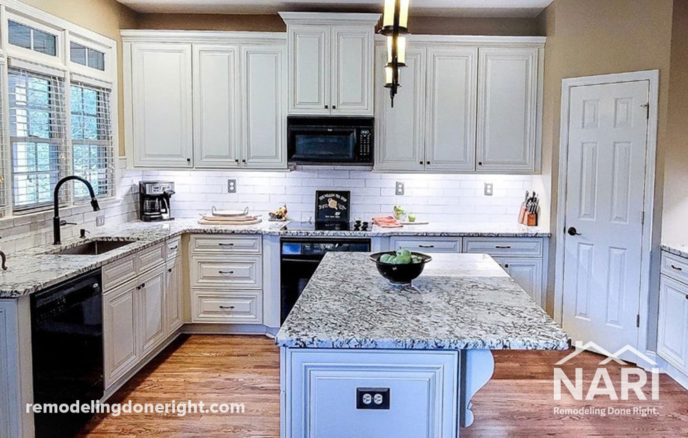These clients desired a culinary café with a transitional style in the kitchen's existing layout, yet this kitchen remodel started with the words no one wants to hear: water damage. The bleak outlook of a lengthy repair project was circumvented and the dark space was transformed with high-quality cabinetry, undercabinet lighting, granite countertops, and an updated island. All coalesce to achieve a Café ambiance. Convenience accessories such as soft close cabinet doors and drawers offer the perfect amount of luxury. Existing appliances and pendants were used to stay in budget. From demolition to completion the project was achieved in under three weeks.