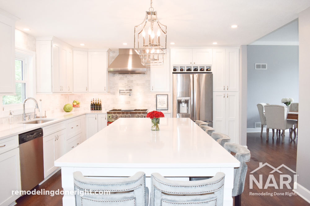 These clients love to entertain, but they were frustrated with having their guests squished into a small, outdated and dark kitchen and a separate dining space during get-togethers. They desired a kitchen with lots of light, and an open, airy feel, but was still practical for daily family life. The kitchen was transformed into an open, welcoming, and illuminated space that enhances every gathering with white cabinetry, and a large, 9-foot by five-foot island with white quartz countertops. In addition, a 30-inch opening from the main room to the kitchen space was opened up five feet. Now the clients and their guests can move comfortably during get-togethers.