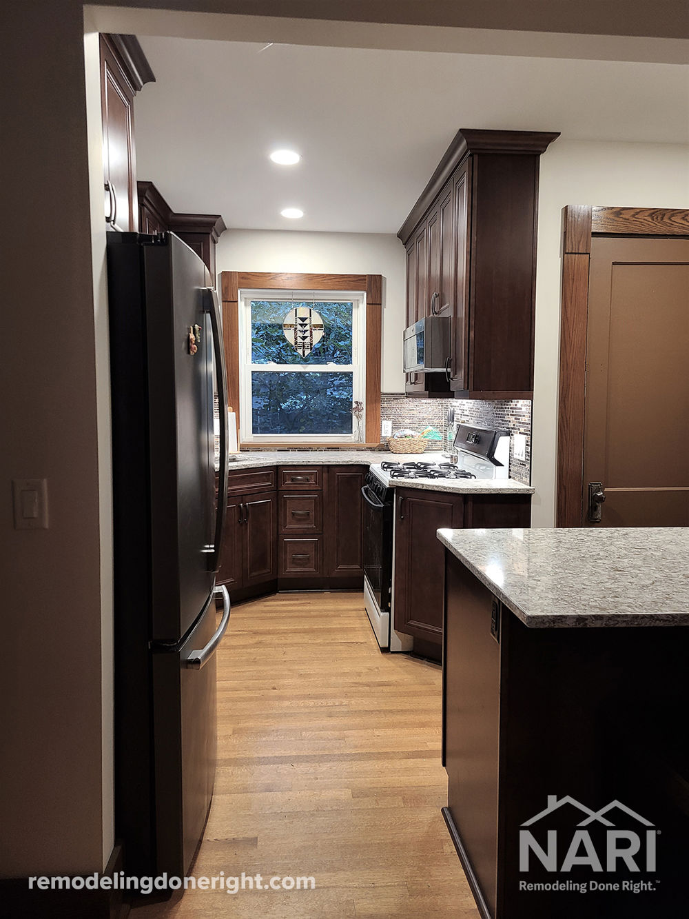 This 1923 kitchen was like a time capsule with its original pedestal kitchen sink and stick built cabinetry lining only one wall. A lack of storage and countertop space was obvious and the first request of the homeowner was to correct this problem. They also desired modern appliances and improved flow and function. Removing the chimney and dividing wall opened up this small space. Additionally, new stained maple cabinetry and countertops added function, while undercabinet lighting highlights the mosaic backsplash tile and corners. The kitchen's first dishwasher was installed to modernize the space as well, helping create a great place to enjoy cooking.