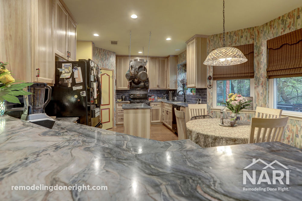 This charming kitchen was full of character, it just needed a face-lift to be revived. The goal was to make the space feel larger and brighter, add storage and complement the client's request to keep the existing wallpaper and pantry door. New custom hickory cabinets are topped with Explosion Blue granite counter tops. The new island provides more workspace and storage. Other finishes include a blue ceramic subway tile backsplash and colorful cabinet hardware for added flare to this space which kept the existing appliances.