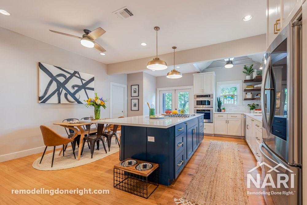 The original kitchen in this 1939 home was closed off, outdated and dark. The clients desired an open concept kitchen and living space for entertaining. Extensive renovations were needed to open up the space, including removing an existing support beam, patching the original wood floors, and updating old and charred electrical wiring. Now the new kitchen is bright and open with tons of cabinets, updated appliances and abundant countertop space. This kitchen is clean and classy with a fun, vibrant island that enhances the feel of the home.