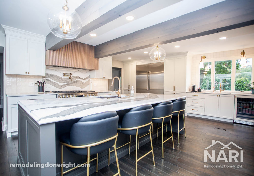 The homeowners of this newly acquired house wanted a large open-concept kitchen for their growing family. To accomplish this, a load-bearing wall between the old dining room and small galley kitchen was removed and a new steel beam and post system installed. The structural beam was wrapped in wood cladding and an additional faux beam put in for balance. Both beams now terminate into a custom reeded hood. A large gathering island full of storage is the centerpiece of the new kitchen. A 48-inch dual-fuel range and 60-inch refrigerator / freezer were also selected for this family who loves to entertain.