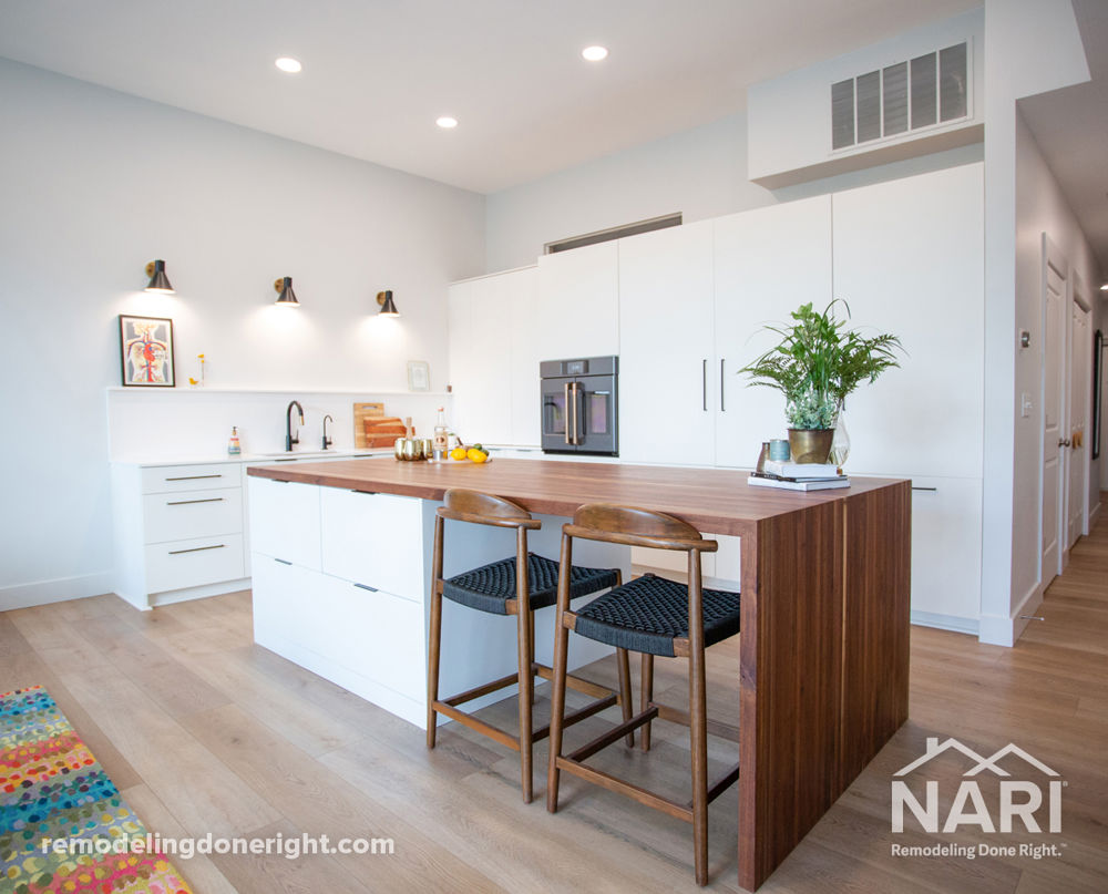 The main objective of this remodel was to transform a boring condo kitchen into a modern, Scandinavian-inspired space for the retired, nomad homeowners. Adding hidden appliance panels, pantry storage, and an integrated Walnut waterfall island created a Zen, open floor plan in this compact condominium. A built-in quartz picture ledge allows the homeowners to quickly update photos from their latest travels. The multi-purpose island includes a hidden printer and lateral files. A new French door oven allows for aging-in-place, while the new LVT floor adds durability and easy maintenance.