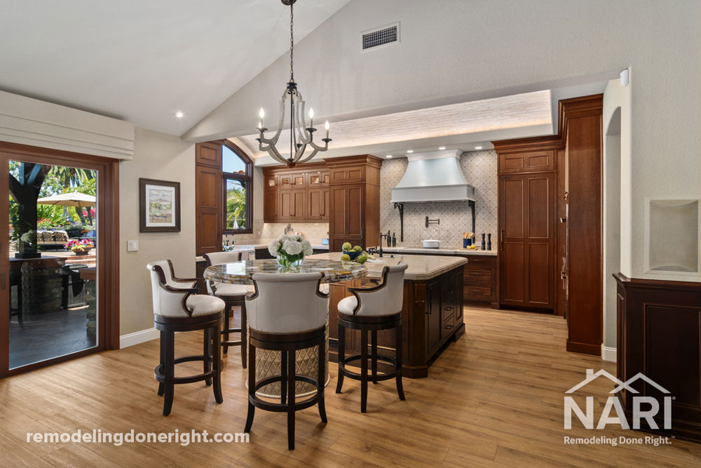 A semi-retired couple who love to cook and entertain on a grand scale wanted a large kitchen with traditional elements. Their existing family room and kitchen felt out of proportion. Thoughtful architecture and design, including an addition pushing the kitchen into the backyard, made the whole space feel more aligned and inviting. Substantial cherry cabinetry, a meticulously crafted barrel ceiling, wrought iron corbels on the hood, and the use of natural stone combine to communicate Old World elegance inspired by Tuscan design. The homeowners love the way their new kitchen is ideal for enjoying together or sharing at festive gatherings.
