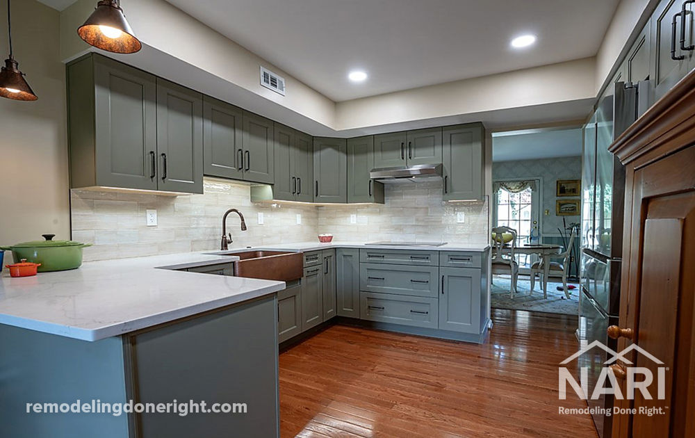 The client expressed the need for a new kitchen with improved functionality and additional storage to better use the space The existing kitchen lacked counter space and had insufficient lighting. The new kitchen features olive cabinetry complemented with a copper farm sink, creating a stunning focal point. Taking over some of the adjacent open area allowed for an elongated run of cabinets, gaining more countertop space in the process. The original linoleum flooring was replaced with prefinished hardwood flooring that matches the rest of the space. Without any major demolition, the changes provided the client their ideal space.