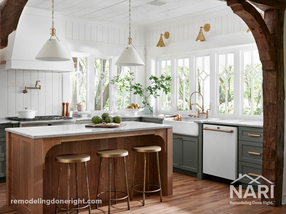 This 1930s home already had so much charm, but it was fun to peel back the layers and add unique elements to some of its historical features to help them shine through in the final design. This included moving the kitchen back to its original location from when the house was first built. The new kitchen features a custom-built cased opening into the space with reclaimed beams; a custom white oak island with Carrara marble countertops; and brass detailing throughout. Now it's filled with light and natural textures that make the space feel updated while still capturing the nostalgia of the original house.