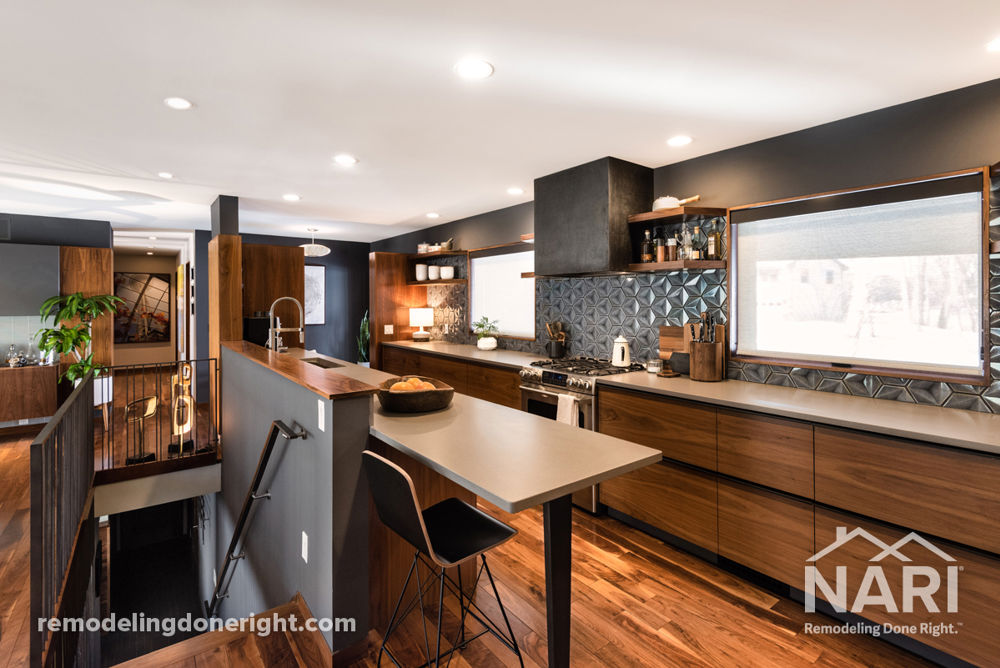 The galley kitchen was the first thing this homeowner wanted to change when she bought her beautiful midcentury home. It felt dark and cramped, with cheap cabinets and outdated features. She desired a modern, Zen kitchen that harmonized with the rest of the home. Her new kitchen features an open wall to the living and dining room, custom cabinets, open shelving, a hexagonal tile backsplash, a custom range hood, new appliances and midcentury details.