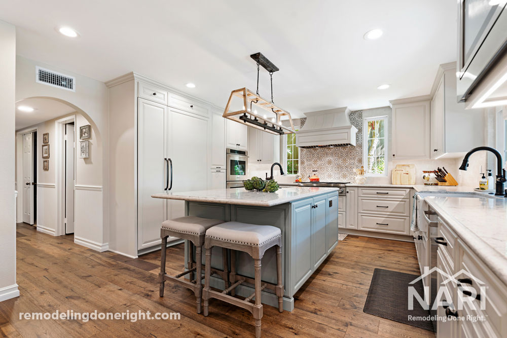 This client, who has a large family and loves to cook for holiday gatherings, was desperately in need of a larger kitchen. An existing hutch originally located in the dining room was incorporated into the new kitchen design with a new quartzite top to replace the existing cracked and stained marble. Demolishing the rarely-used fireplace in the dining room and using that space helped created a kitchen that more than doubled in size. It is now equipped with a panel-ready fridge, a large range top, and a prep sink in the island.