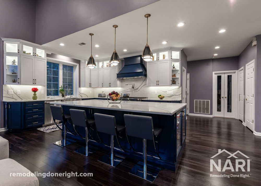 After living in their home for over ten years, the clients felt cramped in their confined kitchen. To address this issue, the kitchen was opened up to adjacent sunroom, the refrigerator was relocated to the left of the fireplace, and a butler wine bar added on the opposite side. The enlarged L-shape kitchen includes custom painted denim blue base cabinetry and white wall cabinets, a wood covered hood in the same finish, a full quartz backsplash with white background and blue veining, and venetian gold hardware. The dark gray-brown cherry wood flooring enhances the colors in the kitchen as well.