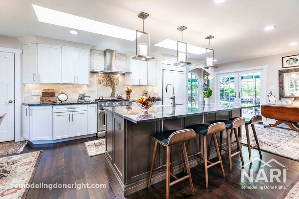 This home had a dark, galley style kitchen separated from the rest of the space by partition walls and two load bearing walls. The new open-concept floor plan provides better traffic flow and features an arched window wrapped around with bookcases and bench seating, French doors, a larger bay window, skylights, a larger double entry door and locker storage. The kitchen includes soft creme cabinetry with a darker contrasting island topped with an exotic marble, and wide plank wood floors. Hand painted Muriel tumble marble was used as a featured wall behind the stove and hood as well.