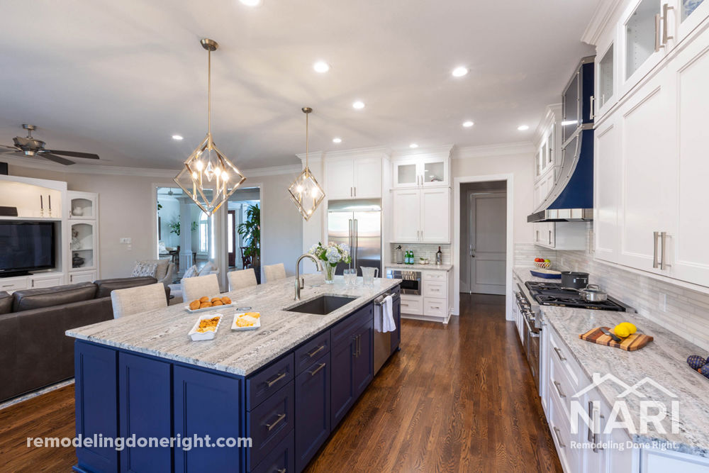 This family was too social to be closed off in a kitchen incongruent with their way of life, and the original window treatments, flooring and load-bearing wall were as dated as they were impractical. Now, the new kitchen opens seamlessly into the living room to allow for a simultaneously social and functional space. Key selections bring the family's style to life, including a resplendent blue oven hood and eye candy hanging lights. The island was finished in a complementary blue finish as well, and the wall cabinetry painted white. From every angle the kitchen provides a clean modern look with an eclectic touch.