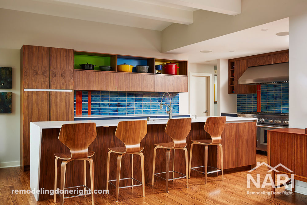 After decades of using a 60s-eque kitchen, this homeowner was ready for a change that better accommodated their needs and style. An odd, underused sitting area was repurposed to add in a long island, and the bar was renewed into a whimsical entertainment hub in order to prioritize storage, function, and flow. The entire kitchen was decorated as a homage to a beloved painting that still reflected the home's roots.