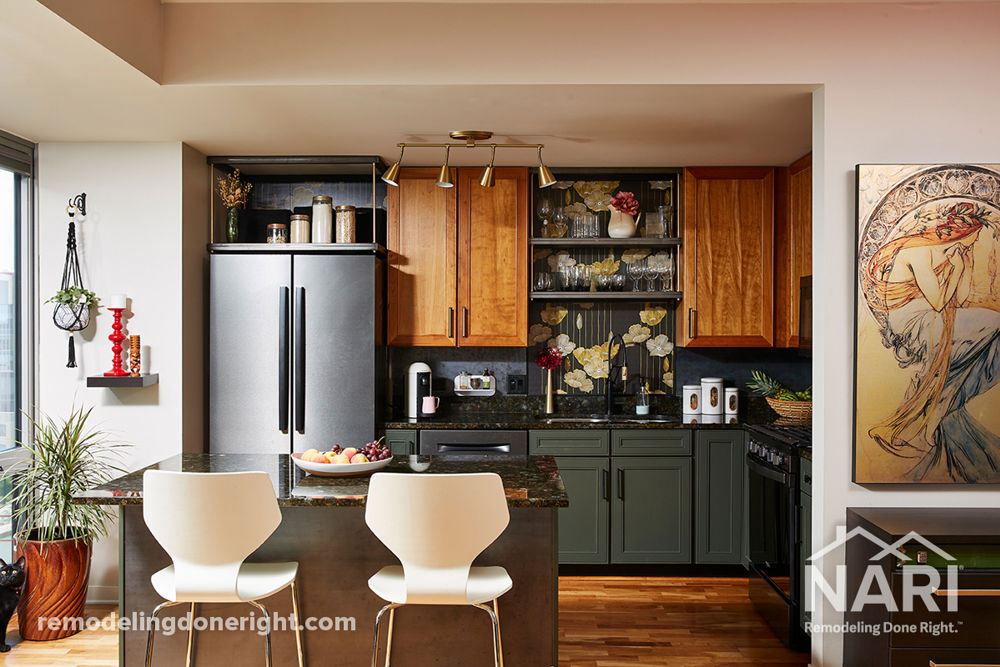 This kitchen update relied on small changes to make big impacts. Hot-rolled steel and brass open shelving and LED linear lighting break up the cherry wood cabinetry for a modern effect. Leveraging existing materials, a compilation of colors, textures, fixtures, and finishes were incorporated to make the entire space a delightful, multi-sensory experience.