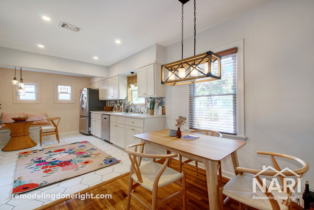 These homeowners wanted to extend home renovations into their kitchen that highlight their eclectic, Bohemian style. By removing a pony wall and relocating a laundry closet, a renewed sense of openness and functionality was brought into the space. The exclusively white kitchen was updated with a floral backsplash mural, strategic lighting, and a pop of color on the wall that showcased their personalities and cemented their kitchen as a hub for gathering.