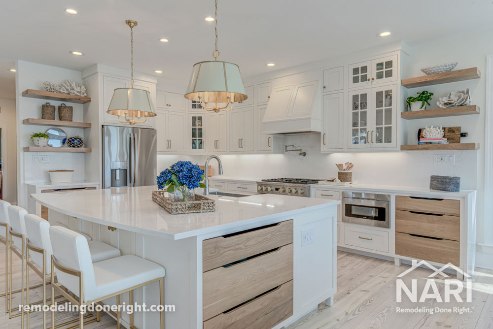 This kitchen renovation prioritized a larger floor plan with updated appliances, electric features, and creative storage solutions. With custom cabinets, stone countertops, and a built-in microwave drawer, it's clear that this traditional kitchen was transformed into a modern-day cooking studio.