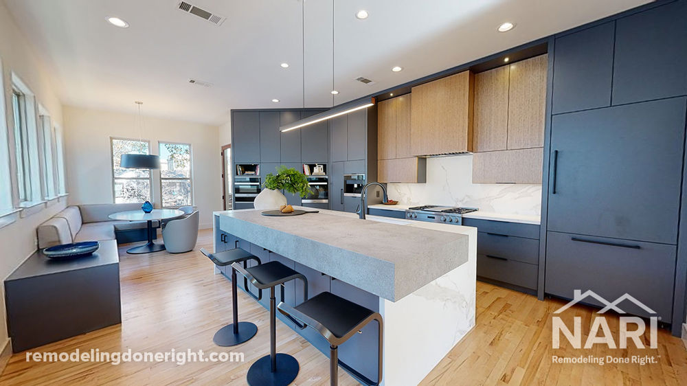 Having updated other areas of their condo, these homeowners were dissatisfied with the outdated kitchen, as the dark cherry cabinets and yellow-toned backsplash no longer suited their taste. Despite its solid structure, layout changes were necessary to create a more modern space. Opting for navy cabinets and a contemporary clean-lined aesthetic, they transformed the space. A large island with a unique porcelain countertop serves as the centerpiece, complemented by new Miele appliances that bring their kitchen to modern day.