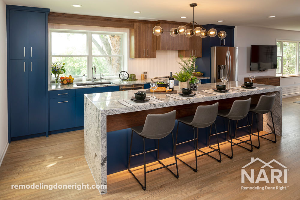Frustrated by a poorly located post in their kitchen, these homeowners wanted to better optimize their space for entertaining friends and family. The updated floorplan touts a back-lit panel on a mid-century-inspired thickened waterfall island, creating a visually open space perfect for their beer and cider samplings. A strategically placed beverage cooler ensures the samples stay cold until it's time for the tasting festivities.