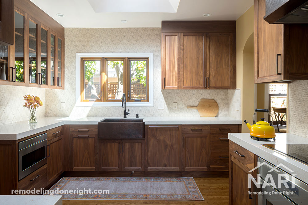 While classic details grace every room, the homeowners found their core gathering space drab and uninviting, particularly for their annual Super Bowl Chili-Cookoff. Looking to open the space into the dining room, a new archway was included to match the existing architecture while remedying the need for a large door. Warm wood tones were chosen to harmonize with details in the dining and living areas, creating a cohesive and a welcoming environment from the moment guests step through the door.
