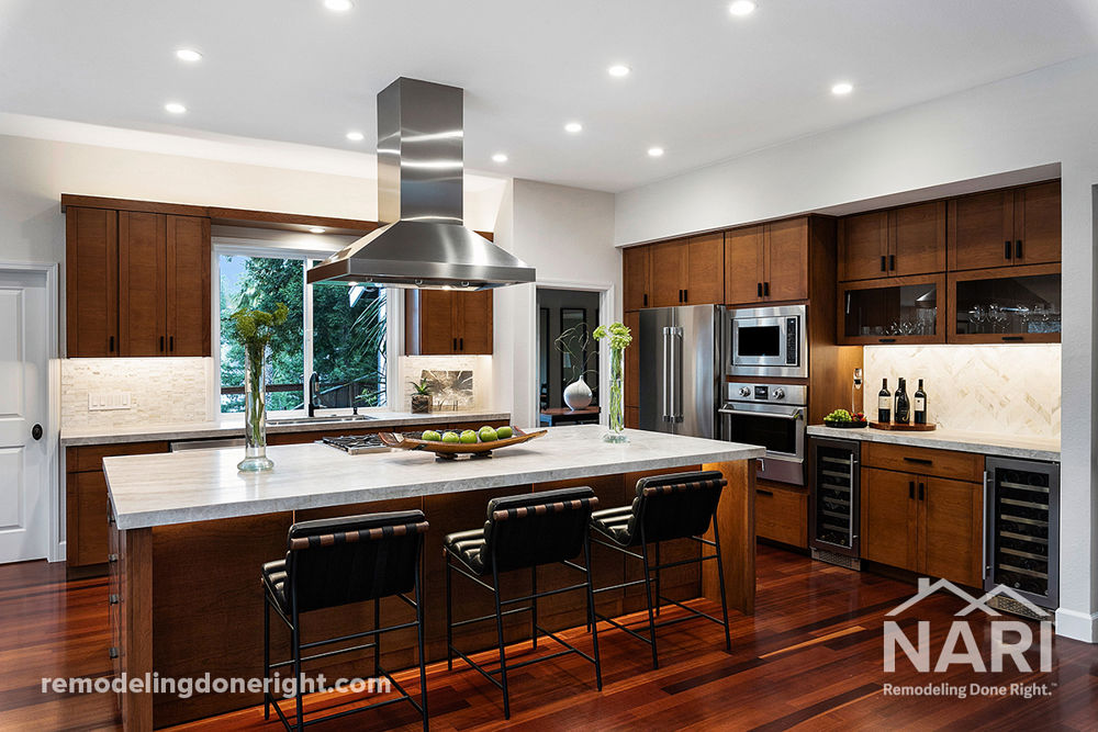 Looking to maximize functional space, the kitchen floorplan was reconfigured to integrate the previously unused area by the stairs. The old, tiered island was redesigned to eliminate the gas cooktop, now providing seating for up to six people and additional hidden storage. The kitchen now features two types of quartz countertops, a mix of shiplap and quartz for the backsplash, and a custom-built hood. Wood floors were refinished and stained in a darker shade, adding warmth and depth to the space.