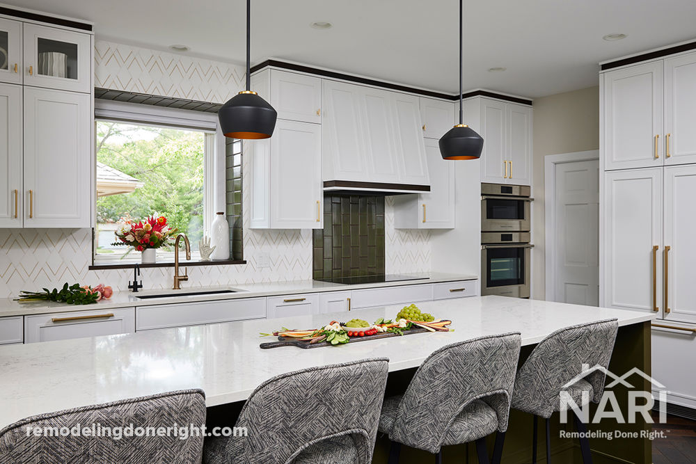 The homeowners wanted to open up their 1990s-era kitchen to the adjacent soaring living/dining spaces to make it an integral part of the main floor. Removing walls and turning a structural post into a three-level functional cabinet now looks like a well-planned feature that anchors a generous island with roomy seating for four. High windows flood the room with light, while warm white custom cabinetry and the latest appliances make this kitchen fabulous and functional. The homeowners now have the open, bright, communal kitchen of their dreams.