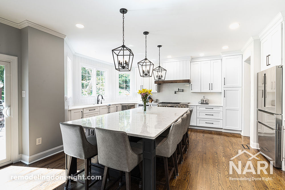 This outdated kitchen was transformed into a functional and aesthetically pleasing space. The new layout utilizes the previously unused area by the stairs. The old tiered island was redesigned to eliminate the gas cooktop and now provides seating for up to six people as well as additional hidden storage. Aesthetically, the kitchen incorporates two different types of quartz countertops along with a mix of shiplap and quartz for the backsplash and custom built hood. The wood floors were refinished and stained throughout in a darker shade, adding warmth and depth to the space.