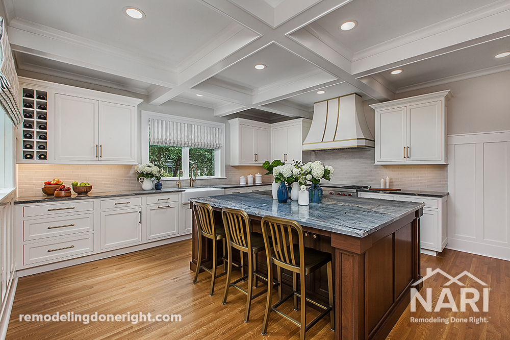 Looking to better accommodate their family of four, these homeowners wanted to update their living space while adhering to the grandeur of their historic home. A more spacious kitchen was created by extending the usable space into the rear yard, highlighted by a 7-foot-wide island and convenient walk-in pantry. The kitchen seamlessly blends modern functionality with historical charm, featuring oversized moldings and wainscotting reminiscent of early 20th-century residences.