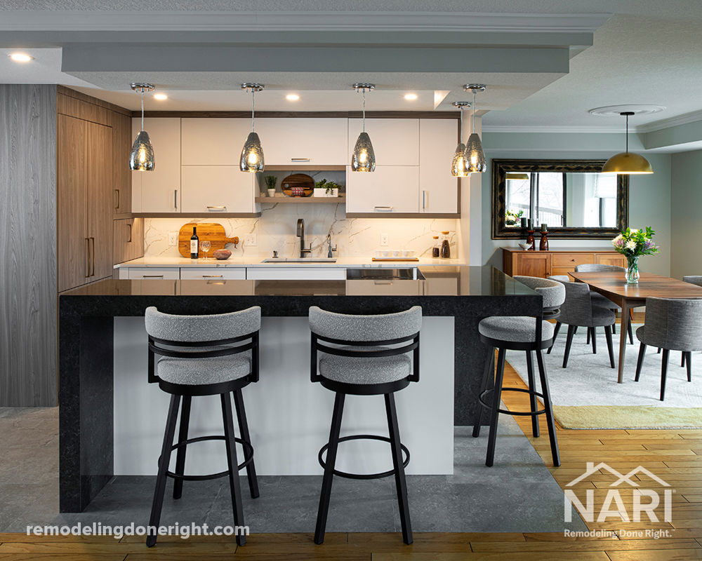 With their home overlooking the lake, these homeowners wanted to open their kitchen and living space to capitalize on their gorgeous views. White cabinets brightened the space, coupled with wood-like cabinets for depth. The raised double waterfall countertop adds additional visual interest to the space while maximizing room for guests. A soffit around the room allowed for electrical lighting above the island and helped visually separate the rooms despite an open floor plan.