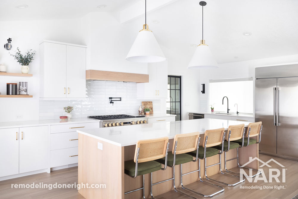 These homeowners envisioned a modern, yet cozy, open-concept space that was conducive to family time. To open the first floor, most of the restrictive walls and ceilings were removed, resulting in an expansive space for the updated kitchen and dining areas. To account for their large family gatherings, an addition was built adjacent to the kitchen to accommodate a spacious butler's-style pantry, enhancing the functional storage capacity and food prep space.