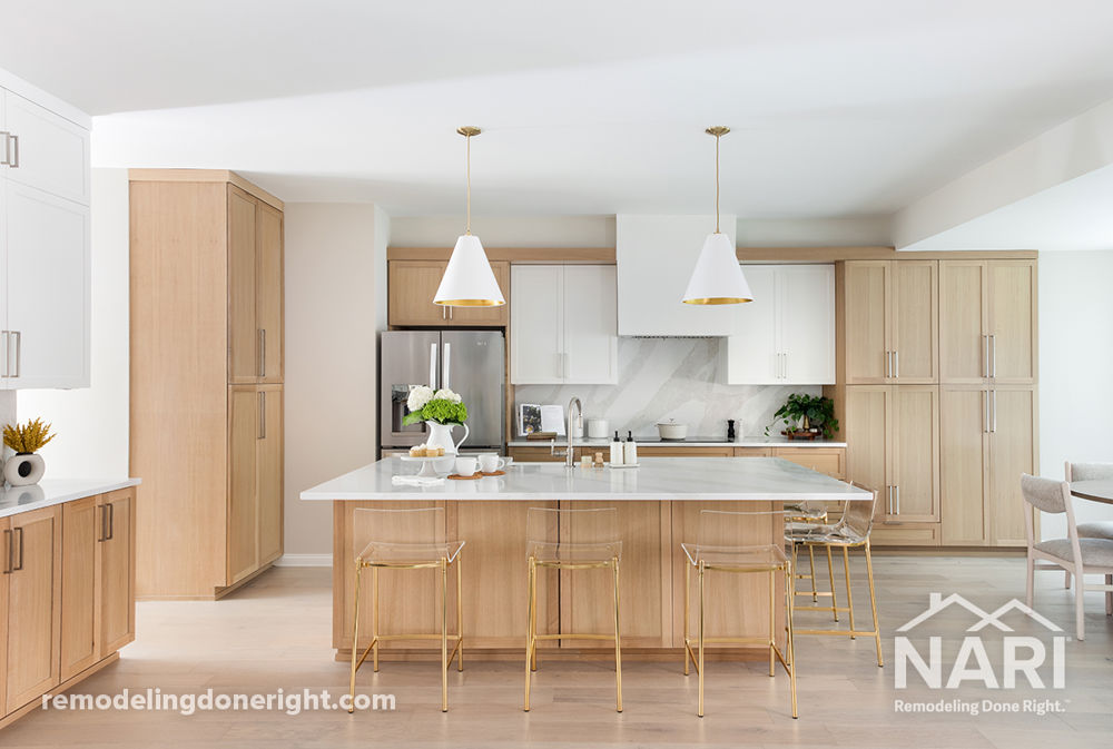Originally the homeowner's childhood residence, it now serves as a haven for their growing family, meaning the remodel needed to balance cherished memories with contemporary elegance. The kitchen stands at the heart of the transformation, featuring warm white oak cabinets and cool countertops, creating a welcoming atmosphere. Exquisite white and gold light fixtures add a touch of luxury, seamlessly combining nostalgia and modern design.