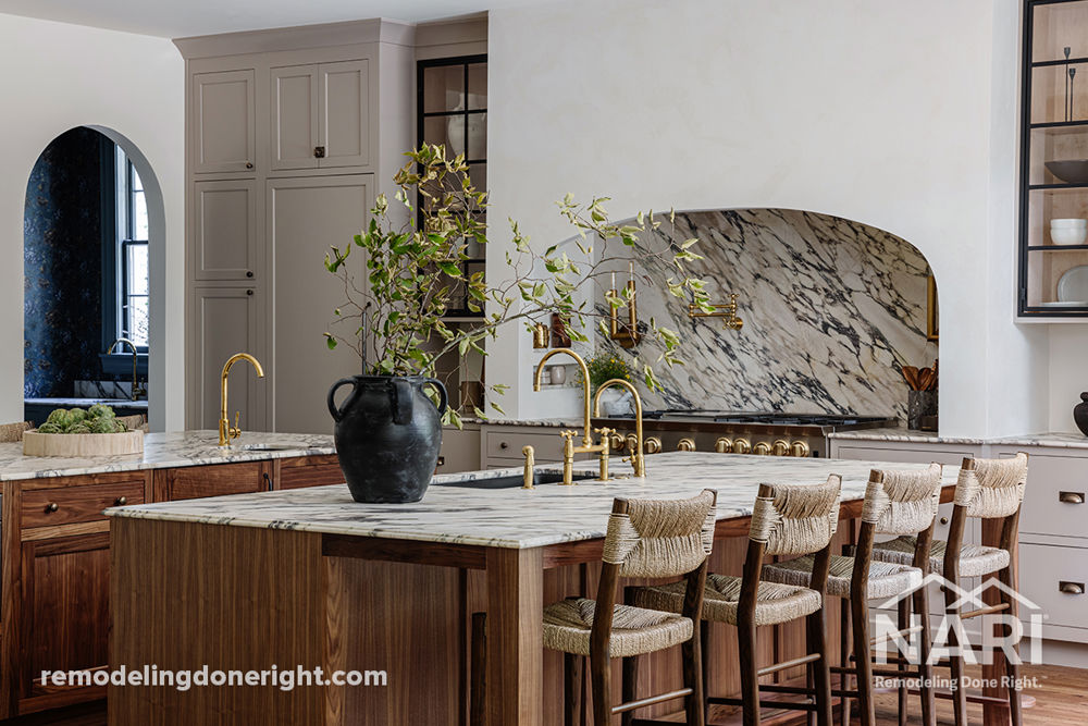 This young, active family of four dreamed of a kitchen remodel that offered a dynamic blend of existing charm and contemporary living. After stripping the existing kitchen of this 1918 home down to its bones, the meticulously crafted new open floor plan design served as the perfect blank canvas, offering room to install a butler's pantry, multiple islands, premium marble countertops, and complimentary gold fixtures. The result is a functional, spacious kitchen where history meets modern aspiration.