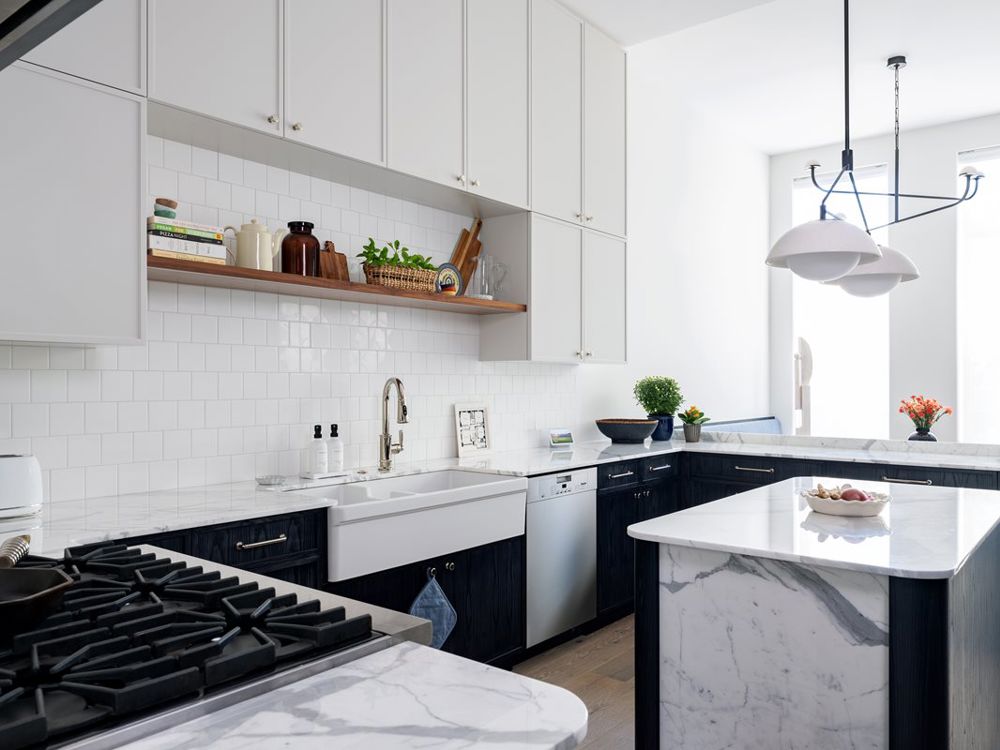 This kitchen underwent a remarkable transformation, evolving from an inefficient layout into a welcoming, multifunctional space perfect for family gatherings and daily use. A practical central island, a peninsula counter, and cozy banquette seating foster cooking, socializing, and homework sessions. The integrated dining area eliminates formality, making the space ideal for casual breakfasts and festive dinners. Custom cabinetry under the stairs maximizes storage with a pull-out pantry, coffee station, and hidden appliances, including a Viking range and 48-inch refrigerator. Navy-stained ash cabinets highlight organic textures, while marble countertops, white subway tiles, and walnut shelving add timeless warmth and elegance.