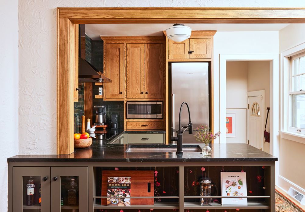 The homeowner loved the charm of this 1920s bungalow but knew the outdated, cramped kitchen needed a remodel. The goal was to create a functional, inviting space with modern amenities while preserving the home's historic character. The renovation included a new layout, upgraded systems, custom oak cabinetry, soapstone countertops, and improved circulation by opening the kitchen to the dining room. A coffee passthrough replaced a closed doorway, maximizing space. Thoughtful design allowed for two cooks and seamless entertaining. Now, the kitchen is a beautiful, efficient showpiece where the homeowner can comfortably host gatherings, fulfilling her vision perfectly.