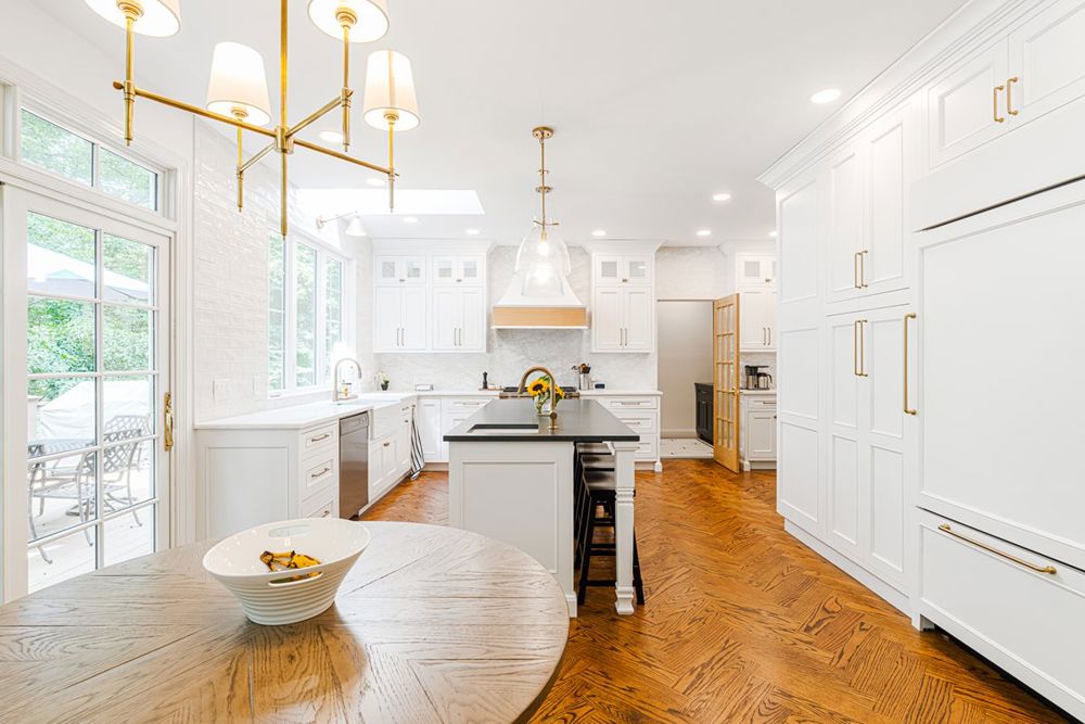 This full kitchen remodel modernized the space and improved functionality for everyday use and hosting. Outdated finishes were replaced with a larger, practical island that complemented the transitional style. The double ovens were moved across from the pantry, creating room for a new coffee nook and additional hosting space. A light, fresh color palette with gold-finished hardware added brightness and elegance to the updated room.
