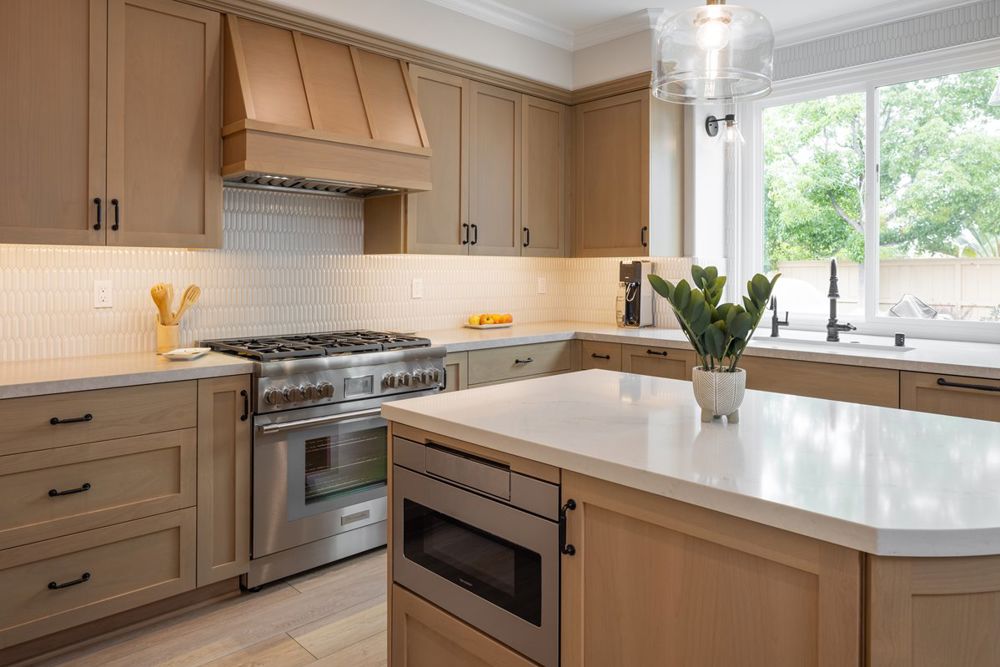 The client approached us with a dated kitchen and family room in need of a modern refresh. With worn tile floors and cherry cabinets, it was time for an upgrade. Expanding wasn't possible due to the outdoor pool, so the layout was optimized by relocating large appliances. A Japandi-inspired design was embraced-slightly adorned, functional, and serene. Warm-hued wood runs through the floors and cabinetry, extending to the family room for a cohesive feel. Light grey quartz complements the cabinetry, while off-glazed tiles add subtle texture. Simple yet elegant lighting and fixtures finish the space, enhancing without overwhelming.
